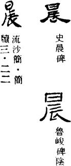 〈辨〉晨字篆书作曟,从晶辰声;晶为星的象形字,晨时星星尚未退尽。楷书作晨,形符改为从日,日出时为晨。