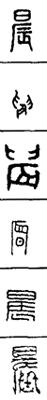 从上到下依次是小篆、甲骨文、金文、古玺及战国文字、缪篆及汉代文字、鸟虫篆。