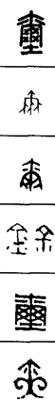 从上到下依次是小篆、甲骨文、金文、古玺及战国文字、缪篆及汉代文字、鸟虫篆。