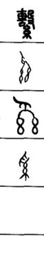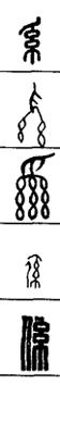 从上到下依次是小篆、甲骨文、金文、古玺及战国文字、缪篆及汉代文字、鸟虫篆。