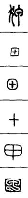 从上到下依次是小篆、甲骨文、金文、古玺及战国文字、缪篆及汉代文字、鸟虫篆。