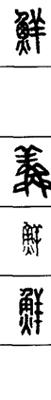 〈辨〉鲜字从鱼,本义为一种鱼名,借用为鲜1的义项①等;声符羴读shān。异体鱻,从三鱼会意,本义为用新鲜的鱼做的食物,引申为鲜1的义项①②③④⑤。鲜2,篆书作尟,以是少会意,是义为此,此少即少此;楷书又作尠,以甚少示意。今通用鲜字。
