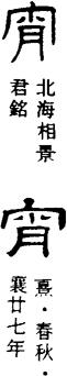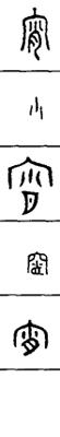 从上到下依次是小篆、甲骨文、金文、古玺及战国文字、缪篆及汉代文字、鸟虫篆。