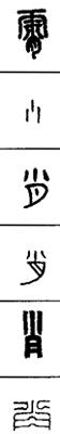 从上到下依次是小篆、甲骨文、金文、古玺及战国文字、缪篆及汉代文字、鸟虫篆。