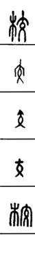 从上到下依次是小篆、甲骨文、金文、古玺及战国文字、缪篆及汉代文字、鸟虫篆。
