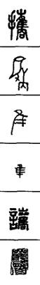 从上到下依次是小篆、甲骨文、金文、古玺及战国文字、缪篆及汉代文字、鸟虫篆。
