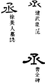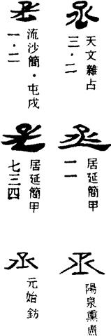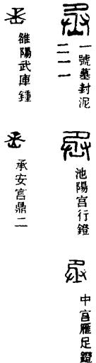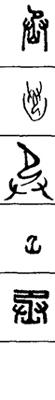 从上到下依次是小篆、甲骨文、金文、古玺及战国文字、缪篆及汉代文字、鸟虫篆。