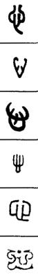 从上到下依次是小篆、甲骨文、金文、古玺及战国文字、缪篆及汉代文字、鸟虫篆。