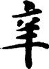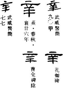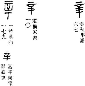 从早期金文的字形来看,辛象一把形似圆凿而末尾尖锐的刀具之形,是一种用来黥面的刑具。此字后来多用为干支名,是天干的第八位。此外,辛还有辛辣之义,也指辛味的蔬菜。又引申为悲痛、酸楚、劳苦等义。汉字中凡从“辛”之字,大多与刑罚及辛味有关,如辜、辟、辣等。