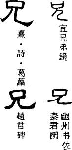 【说明】“兄”为象形字,像人跪着张口祝告形,本是古“祝”字,古代祝告的事一般由兄长承担,所以用来表示兄长义。参附录三。