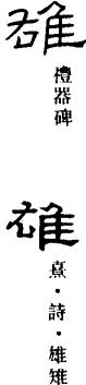 ,甲骨文象麻雀之形,金文、篆书讹变,楷书作隹,《说文》称其为短尾禽之总名。隹字用为偏旁,一般表示与鸟有关的意,有时也作声符。声符厷,读gōng。
