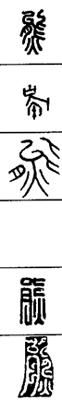 从上到下依次是小篆、甲骨文、金文、古玺及战国文字、缪篆及汉代文字、鸟虫篆。