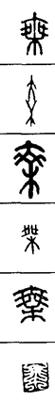 从上到下依次是小篆、甲骨文、金文、古玺及战国文字、缪篆及汉代文字、鸟虫篆。