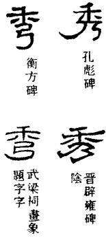 〈辨〉秀字篆书从禾从乃,乃亦声。乃,本象绳形,详乃字下;在此象示禾穗下垂,又为声符。楷书作秀,象形作用丧失。