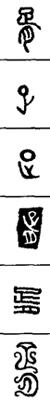从上到下依次是小篆、甲骨文、金文、古玺及战国文字、缪篆及汉代文字、鸟虫篆。