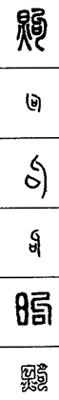 从上到下依次是小篆、甲骨文、金文、古玺及战国文字、缪篆及汉代文字、鸟虫篆。
