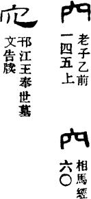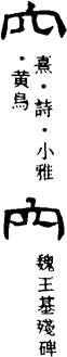从上到下依次是小篆、甲骨文、金文、古玺及战国文字、缪篆及汉代文字、鸟虫篆。