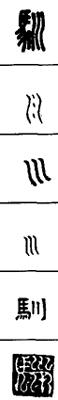 从上到下依次是小篆、甲骨文、金文、古玺及战国文字、缪篆及汉代文字、鸟虫篆。