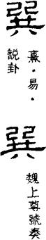巽音xùn。巽和逊上古同属心纽文部,同音通假。巽的本义是具备。《说文》:“巽,具也。”又为《周易》卦名,表风。通逊,谦恭,谦让。《尚书·尧典》:“朕在位七十载,汝能庸命,巽朕位?”(我在位已七十年了,你们有能顺从天命,谦恭地代我居天子之位的吗?马融注:“朕,我也。巽,让也。”)《论语·子罕》:“巽与之言,能无说(yuè)乎?”(谦让顺从的话,能够不高兴听吗?与,顺从,赞扬。说,同悦。)