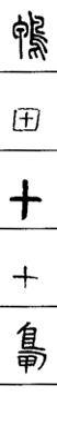 从上到下依次是小篆、甲骨文、金文、古玺及战国文字、缪篆及汉代文字、鸟虫篆。