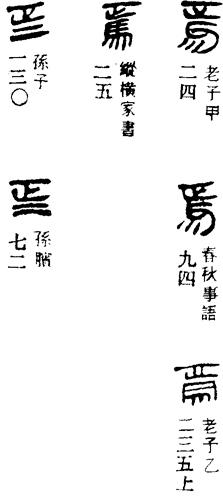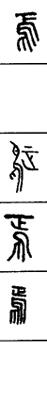 从上到下依次是小篆、甲骨文、金文、古玺及战国文字、缪篆及汉代文字、鸟虫篆。