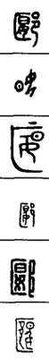 从上到下依次是小篆、甲骨文、金文、古玺及战国文字、缪篆及汉代文字、鸟虫篆。