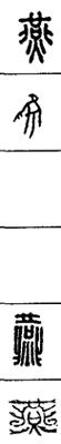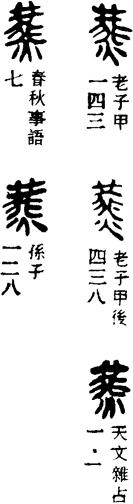 从上到下依次是小篆、甲骨文、金文、古玺及战国文字、缪篆及汉代文字、鸟虫篆。