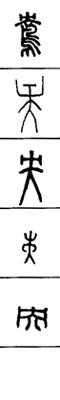 从上到下依次是小篆、甲骨文、金文、古玺及战国文字、缪篆及汉代文字、鸟虫篆。