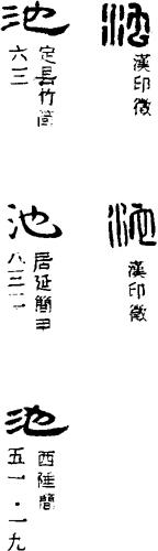 ①水塘。《诗经·小雅·无羊》:“或降于阿,或饮于池。”(阿ē:山丘。)陶潜《桃花源记》:“有良田美池桑竹之属。”②护城河。《左传·僖公四年》:“楚国方城以为城,汉水以为池。”(方城:山名。)《孟子·公孙丑上》:“城非不高也,池非不深也。”今成语有“金城汤池”。③衣被字画等边缘的镶饰。左思《娇女诗》:“衣被皆重池,难与沉水碧。”