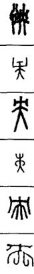 从上到下依次是小篆、甲骨文、金文、古玺及战国文字、缪篆及汉代文字、鸟虫篆。