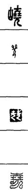 从上到下依次是小篆、甲骨文、金文、古玺及战国文字、缪篆及汉代文字、鸟虫篆。