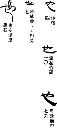 ①语气词。用于句末,表示判断、确认、解释的语气。《左传·宣公二年》:“董狐,古之良史也。”《史记·陈涉世家》:“陈胜者,阳城人也。”以上用在名词谓语句句末,表示判断的语气。《左传·僖公三十二年》:“若潜师以来,国可得也。”(潜师:偷偷派军队。)《礼记·檀弓下》:“小子识之,苛政猛于虎也。”(识zhì:记住。)以上用在动词或形容词性谓语句句末,表示确认的语气。《孟子·梁惠王上》:“古之人与民偕乐,故能乐也。”《史记·廉颇蔺相如列传》:“吾所以为此者,以先国家之急而后私仇也。”以上用在因果句句末,除表示确认的语气外,还有解释的语气。②语气词。用于祈使句句末,表示命令、希望、劝告的语气。《左传·隐公元年》:“不及黄泉,无相见也。”《史记·项羽本纪》:“愿伯具言臣之不敢倍德也。”(伯:项伯。倍:通“背”。)《资治通鉴·汉献帝建安十三年》:“愿早定大计,莫用众人之议也。”③语气词。用于疑问句句末,主要与疑问代词或副词配合,表示疑问语气。《战国策·齐策四》:“来何疾也?”(疾:快。)马中锡《中山狼传》:“岂天之未丧斯文也?”④语气词。用于句中,表示停顿,有强调或提示作用。《左传·襄公三年》:“午也可。”(午:祁午,人名。)《论语·微子》:“且而与其从辟人之士也,岂若从辟世之士哉?”(辟:躲避。)《庄子·山木》:“向也不怒而今也怒。”(向:从前。)⑤副词。承接上文,表示同样。庾信《镜赋》:“不能片时藏匣里,暂出园中也自随。”