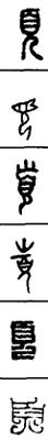 从上到下依次是小篆、甲骨文、金文、古玺及战国文字、缪篆及汉代文字、鸟虫篆。