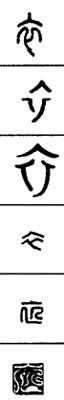从上到下依次是小篆、甲骨文、金文、古玺及战国文字、缪篆及汉代文字、鸟虫篆。