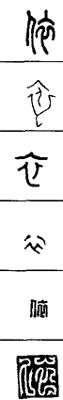 从上到下依次是小篆、甲骨文、金文、古玺及战国文字、缪篆及汉代文字、鸟虫篆。