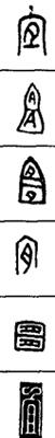 从上到下依次是小篆、甲骨文、金文、古玺及战国文字、缪篆及汉代文字、鸟虫篆。