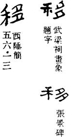 从上到下依次是小篆、甲骨文、金文、古玺及战国文字、缪篆及汉代文字、鸟虫篆。