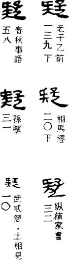 〈辨〉疑字甲骨文象人持杖而立,左顾右盼,徘徊于歧路的样子;有时字有省略。金文或者改从彳为从辵,又加声符牛;或者改从彳为从止,又加声符“子”。篆书讹变为从子从止从匕从矢,字形已无法分析,楷书作疑。