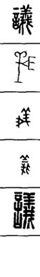 从上到下依次是小篆、甲骨文、金文、古玺及战国文字、缪篆及汉代文字、鸟虫篆。