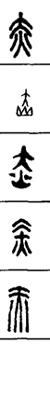 从上到下依次是小篆、甲骨文、金文、古玺及战国文字、缪篆及汉代文字、鸟虫篆。