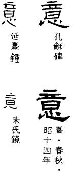 意音yì。意的本义是心意。《说文》:“意,志也,察言而知意也。”意又有预料,猜想的意思。段注:“意之训为测度,其字俗作億。”《论语·子罕》:“子四绝——毋意,毋必,毋固,毋我。”(孔子断绝了四种毛病——不凭空揣测,不绝对肯定,不固执己见,不唯我独是。)《庄子·胠箧》:“夫妄意室中之藏,圣也;入先,勇也;出后,义也;知可否,知也;分均,仁也。”(盗如果猜想到屋内储藏的东西,就是高明的;带头进去,就是勇;最后出来,就是义;判断能不能下手,就是智慧;分赃均匀,就是仁义。二个“知”:第一个‘知’,动词,知道;第二个‘知’,同智。)《商君书·修权》:“夫释权衡而断轻重,废尺寸而意长短。”(抛弃量具却去判断轻重,丢掉尺寸却来猜度长短。释,放下,放弃。权衡:权,秤锤;衡,秤杆。此泛指量具。)“预料,猜想”义,后来加义符“人”写作“億”。