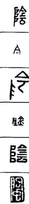 从上到下依次是小篆、甲骨文、金文、古玺及战国文字、缪篆及汉代文字、鸟虫篆。