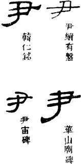 尹字是个会意字。古文字的尹字,象人手持杖之形。手杖是一种权力的象征,手握权杖即表明有权力处理大小事务,故尹字有治理之义。后来尹字多用作官名,如京兆尹、县尹等。而作为姓氏的尹,则是从“尹氏”这种官职名称演变而来的。