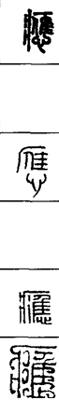 从上到下依次是小篆、甲骨文、金文、古玺及战国文字、缪篆及汉代文字、鸟虫篆。