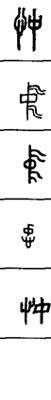 从上到下依次是小篆、甲骨文、金文、古玺及战国文字、缪篆及汉代文字、鸟虫篆。