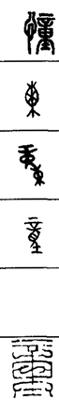 从上到下依次是小篆、甲骨文、金文、古玺及战国文字、缪篆及汉代文字、鸟虫篆。