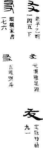 从上到下依次是小篆、甲骨文、金文、古玺及战国文字、缪篆及汉代文字、鸟虫篆。
