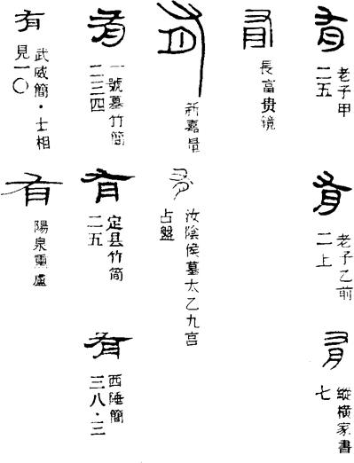 古文字的有字,从又从肉(月),象人手持肉块之形,表示持有之意。有的本义指占有、取得,与“无”相对,引申为存在之义。