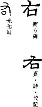 〈辨〉右字甲骨文字形象右手之形,用为方位词或保佑的佑;也借用为副词,表示再。金文、篆书作右,用为左右字或保佑字;右字可释为从又从口会意,表手和口相助的意思,但造字之初恐怕只是为了和副词“又”相区别。后来又造佑和祐,为保佑的专字,右只做方位词。