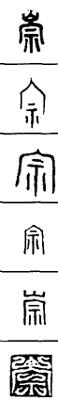 从上到下依次是小篆、甲骨文、金文、古玺及战国文字、缪篆及汉代文字、鸟虫篆。